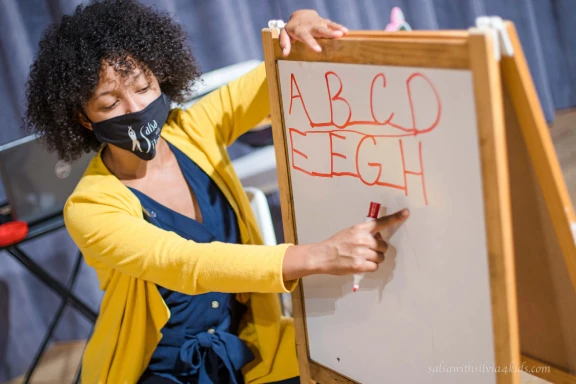 Photo above: Salsa With Silvia dance instructor Amber teaching school classes at the studio during the pandemic.